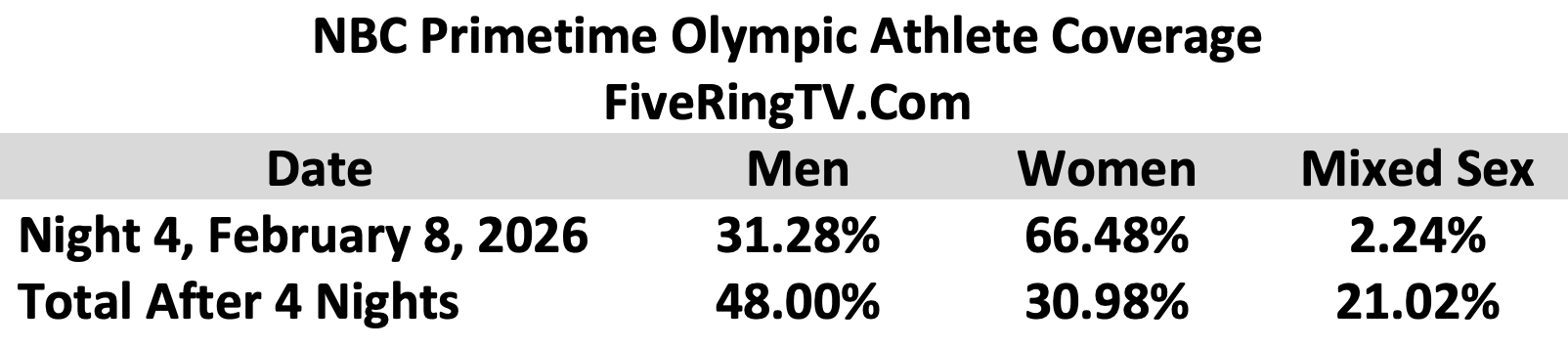 Overall, coverage of men’s events accounted for 31.28% of NBC’s primetime Olympic broadcast. Women’s events received 66.48% of the coverage. Mixed sex events (e.g., ice dancing) received 2.24% of NBC’s coverage.