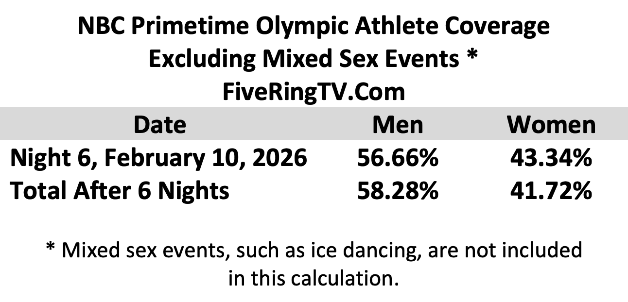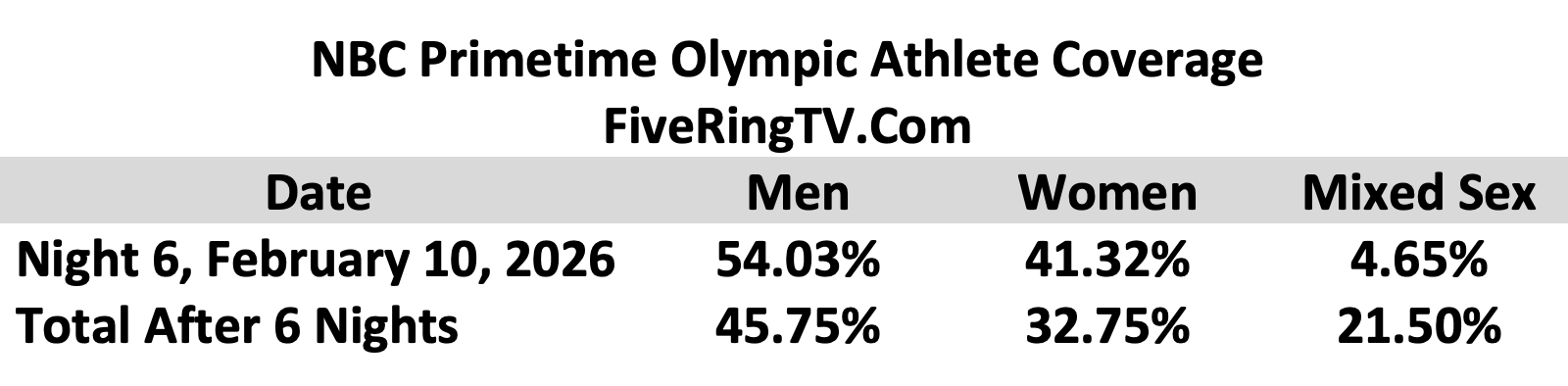 Overall, coverage of men’s events accounted for 54.03% of NBC’s primetime Olympic broadcast. Women’s events received 41.32% of the coverage. Mixed sex events (e.g., ice dancing) received 4.65% of NBC’s coverage.