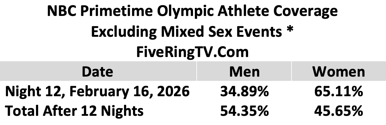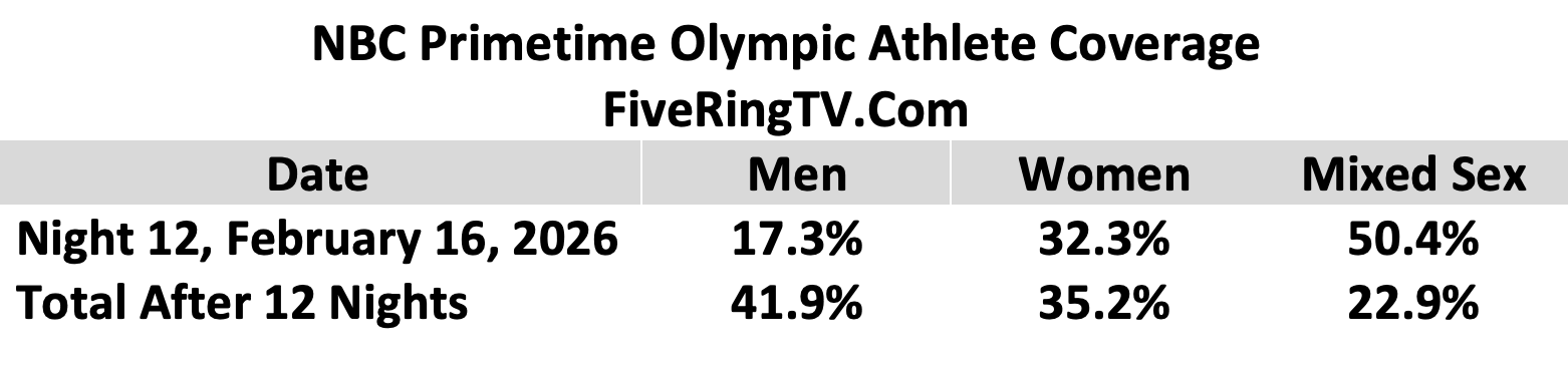 Overall, coverage of men’s events accounted for 17.3% of NBC’s primetime Olympic broadcast. Women’s events received 32.3% of the coverage. Mixed sex events (e.g., ice dancing) received 50.4% of NBC’s coverage.