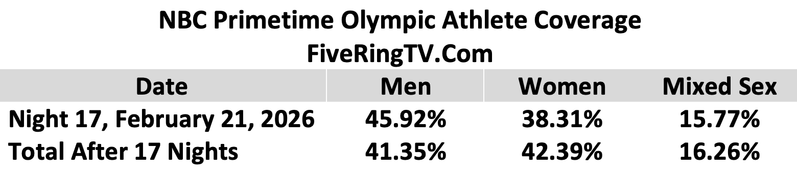 Regular updates about NBC’s primetime coverage of men’s and women’s sports will be posted throughout the 2026 Milano Cortina Winter Games on FiveRingTV.com. Updates are also be posted on the @FiveRingTV X feed and the @FiveRingTV Bluesky feed. A final Olympic report, with complete sport-by-sport coverage breakdowns, will also be issued.