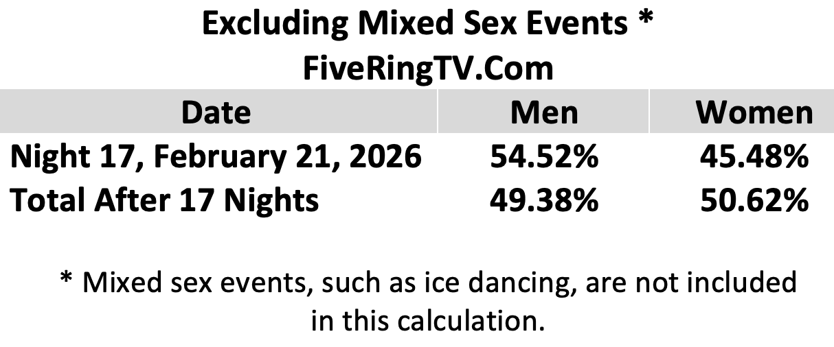 Men’s sports received more airtime than women’s sports during NBC’s primetime Olympic broadcast on Saturday, February 21, 2026, narrowing the coverage gap to less than 19 minutes.